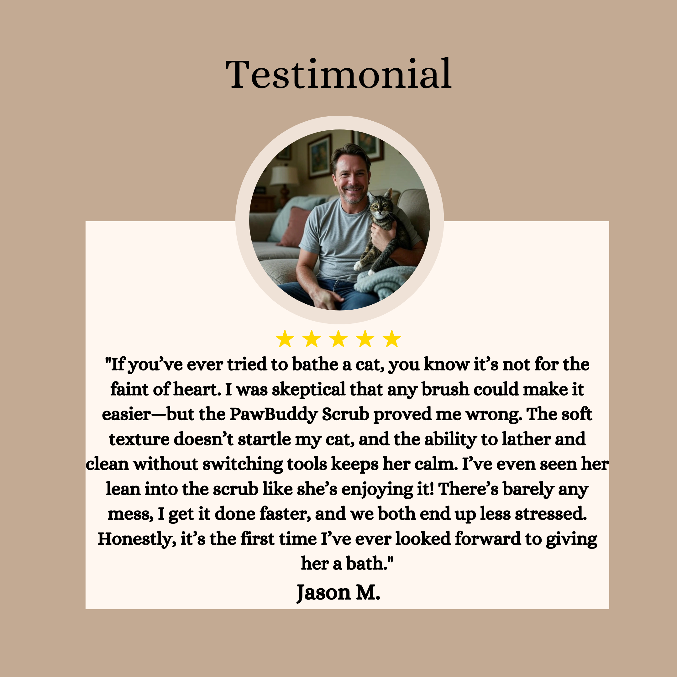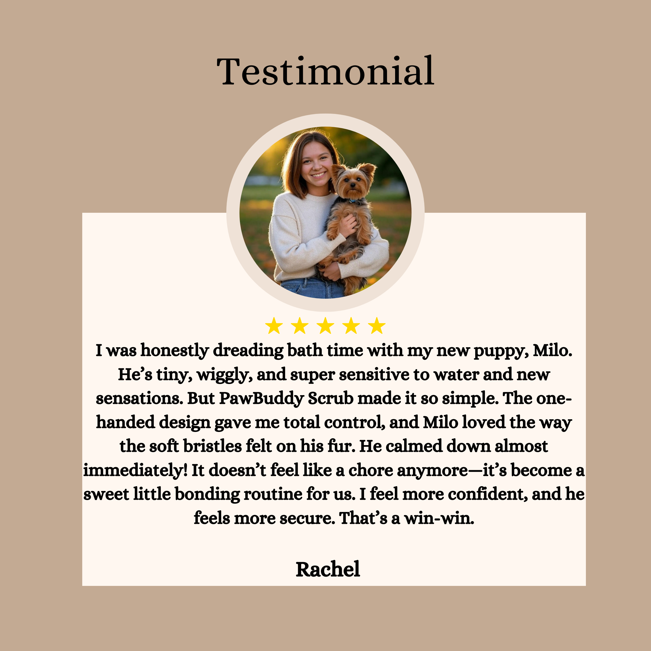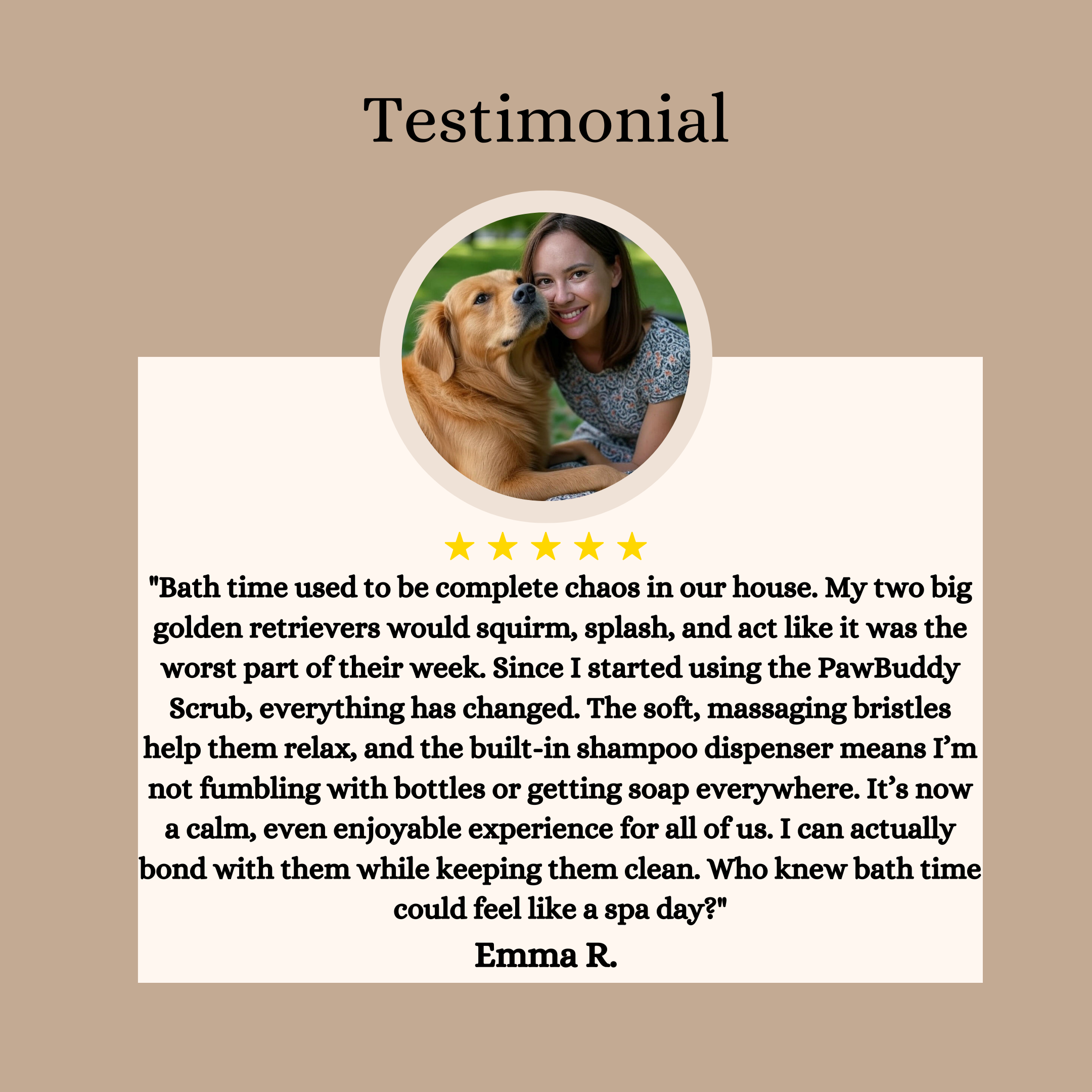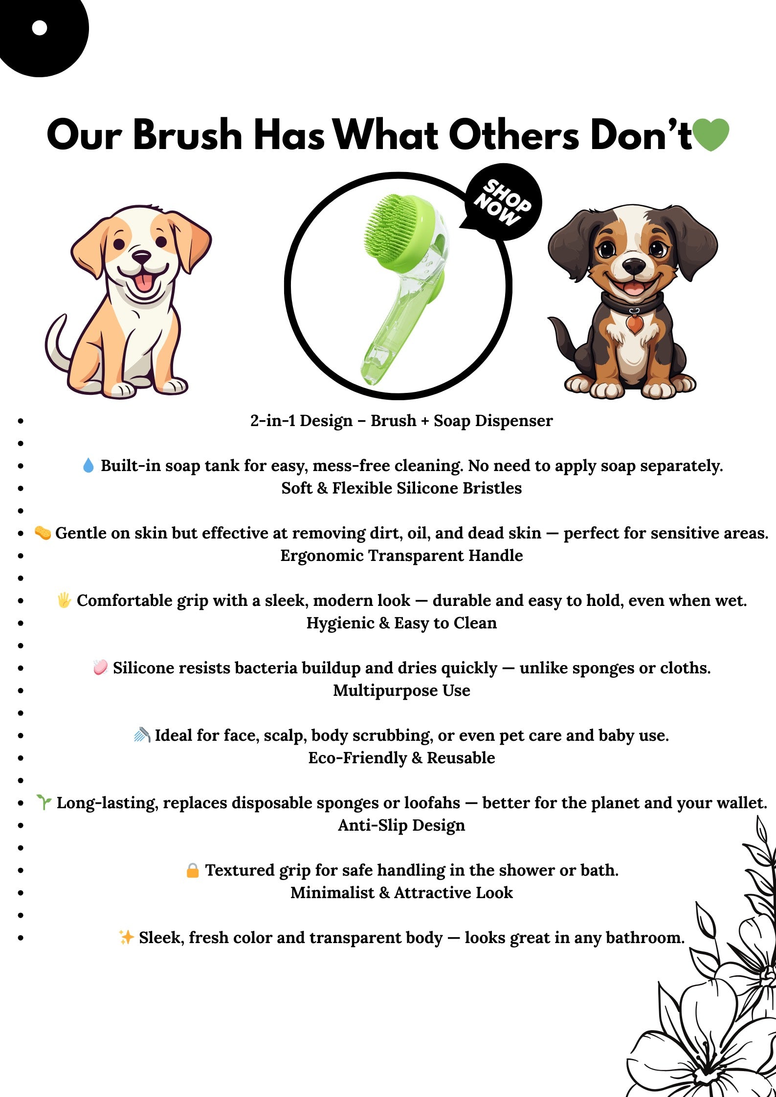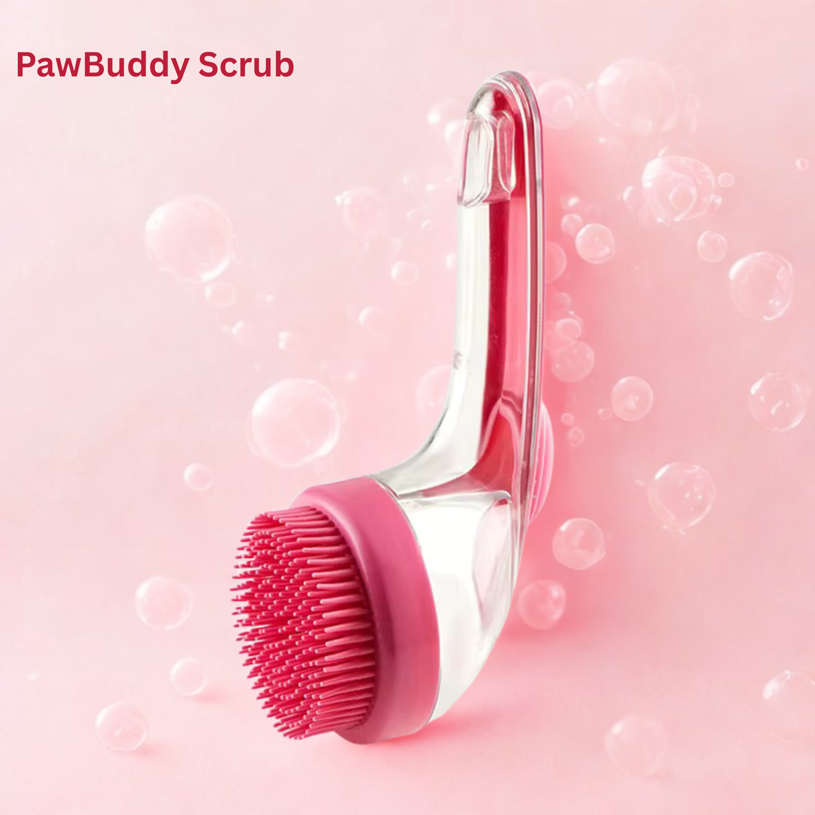Introducing the PawBuddy Scrub , the all-in-one pet bath brush with a built-in shampoo dispenser that turns washing into a stress-free spa moment. With soft, massaging nubs and a smart soap reservoir, PawBuddy Scrub transforms scrubbing into soothing.